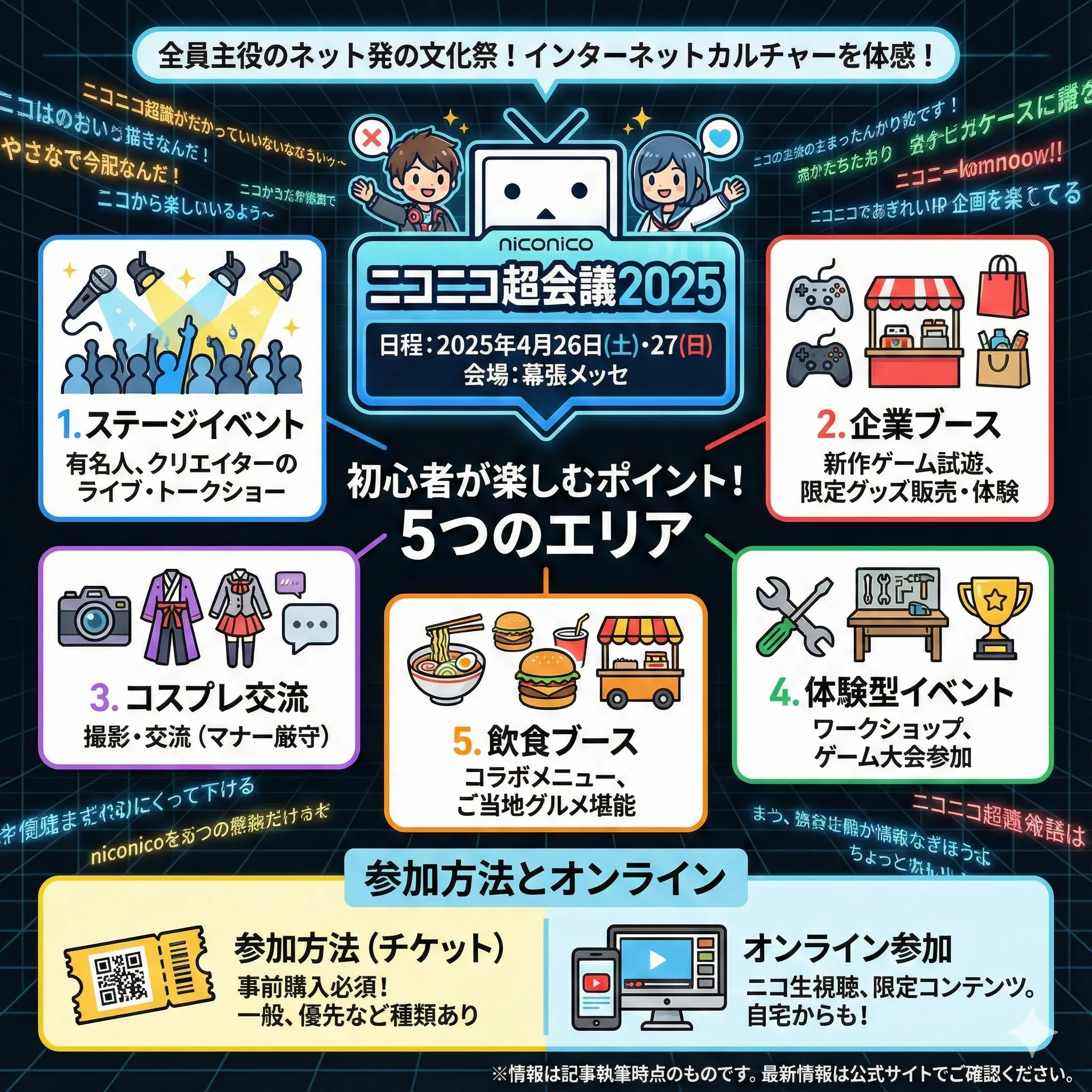 初めての参加は多少ハードルが高いかもしれませんが、ニコニコ超会議の公式SNSなどの情報を入手して、存分にイベントを楽しんでください。