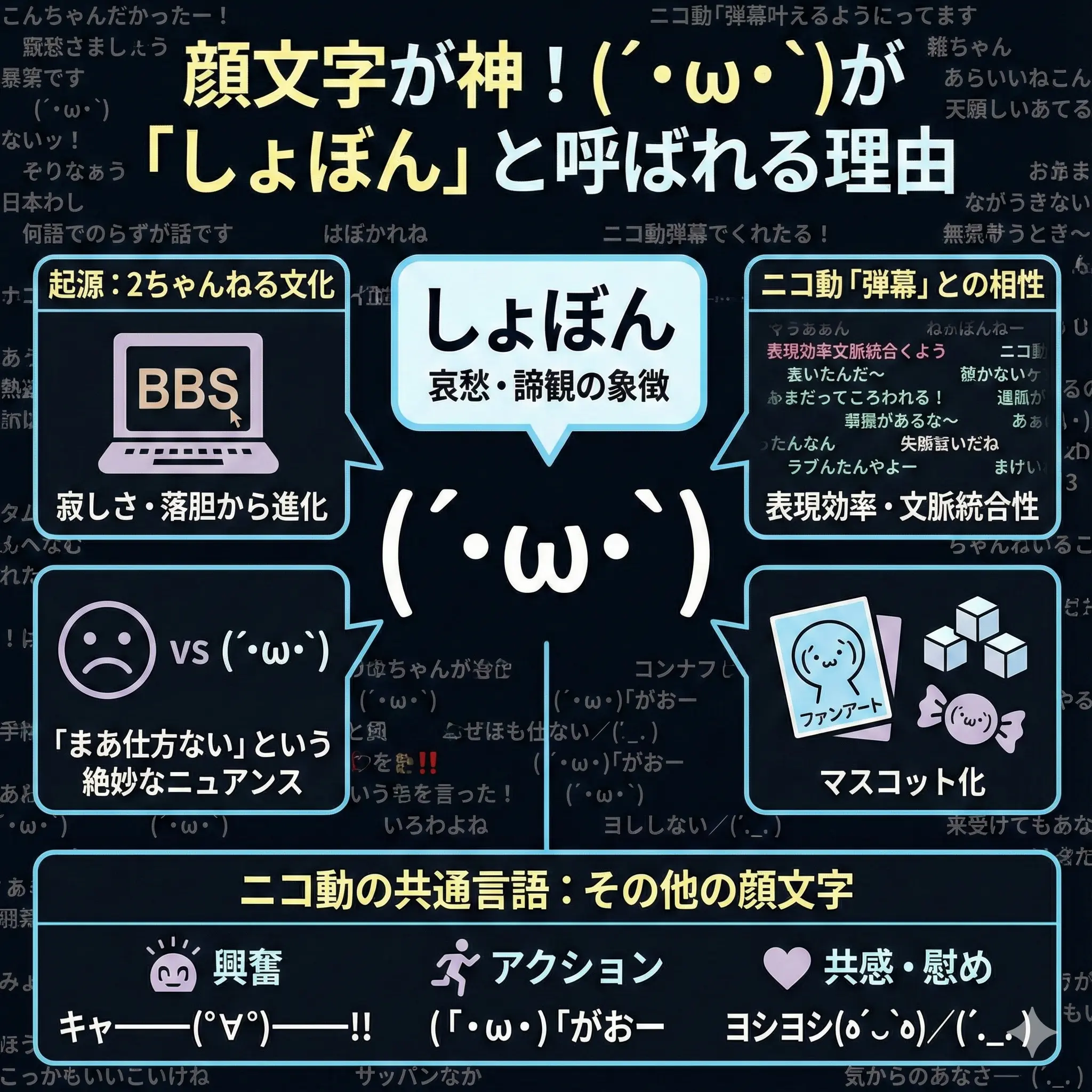 (´・ω・`)が「しょぼん」と呼ばれる理由は、その顔文字が持つ「寂しさ」や「落胆」といった感情的背景を、ユーザーが共有してきた歴史にあります。それは2ちゃんねるからニコニコ動画へと続く、日本のインターネット文化そのものです。
