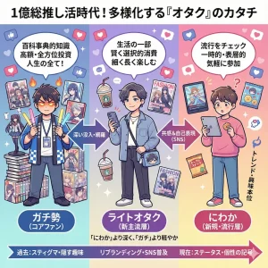 この言語的なリブランディングは、趣味の活動を主流の価値観に合致させ、「気持ち悪い」という認識を緩和するのに貢献したと私は考えます。特に、歴史的なスティグマを経験していないZ世代のような若い世代にとって、「オタク」であることは、もはや負の烙印ではなく、SNSを通じて他者と繋がり、自己のアイデンティティを表現するためのニュートラルな「記号」となっているのです。
