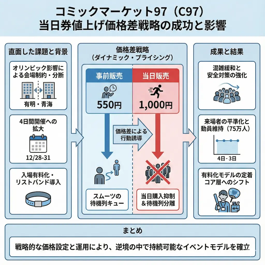 当日券の値上げによる混雑緩和は、今後の大規模イベントにおけるモデルケースとなるでしょう。フリーライドを抑制し、対価を払う参加者を優遇するシステムは、イベントの持続可能性を高めるために不可欠です。