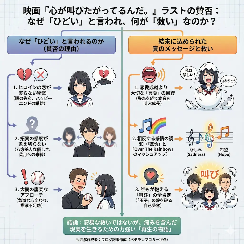 『心が叫びたがってるんだ。』は、名作『あの日見た花の名前を僕達はまだ知らない。』のスタッフが再結集した話題作ですが、そのラストシーンについては現在でも「感動した」「いや、ひどい」と意見が真っ二つに分かれています。