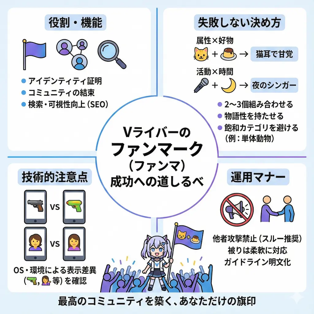 本記事では、ファンマークの定義から戦略的な決め方、そして技術的な注意点までを網羅的に解説します。これを読めば、あなただけの最強の旗印を手に入れることができます。