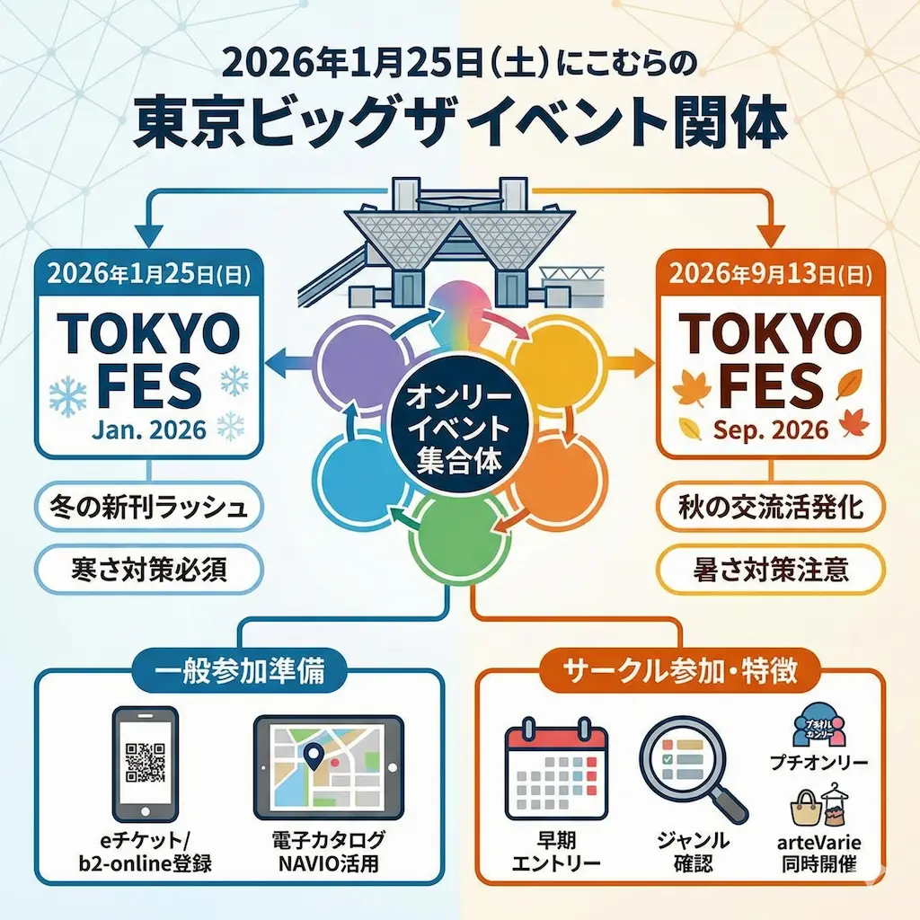 2026年のTOKYO FESは、1月25日と9月13日の二大開催を軸に動きます。チケットの確保、カタログでの下調べ、サークル申し込みのすべてにおいて早めの行動が成功を左右します。