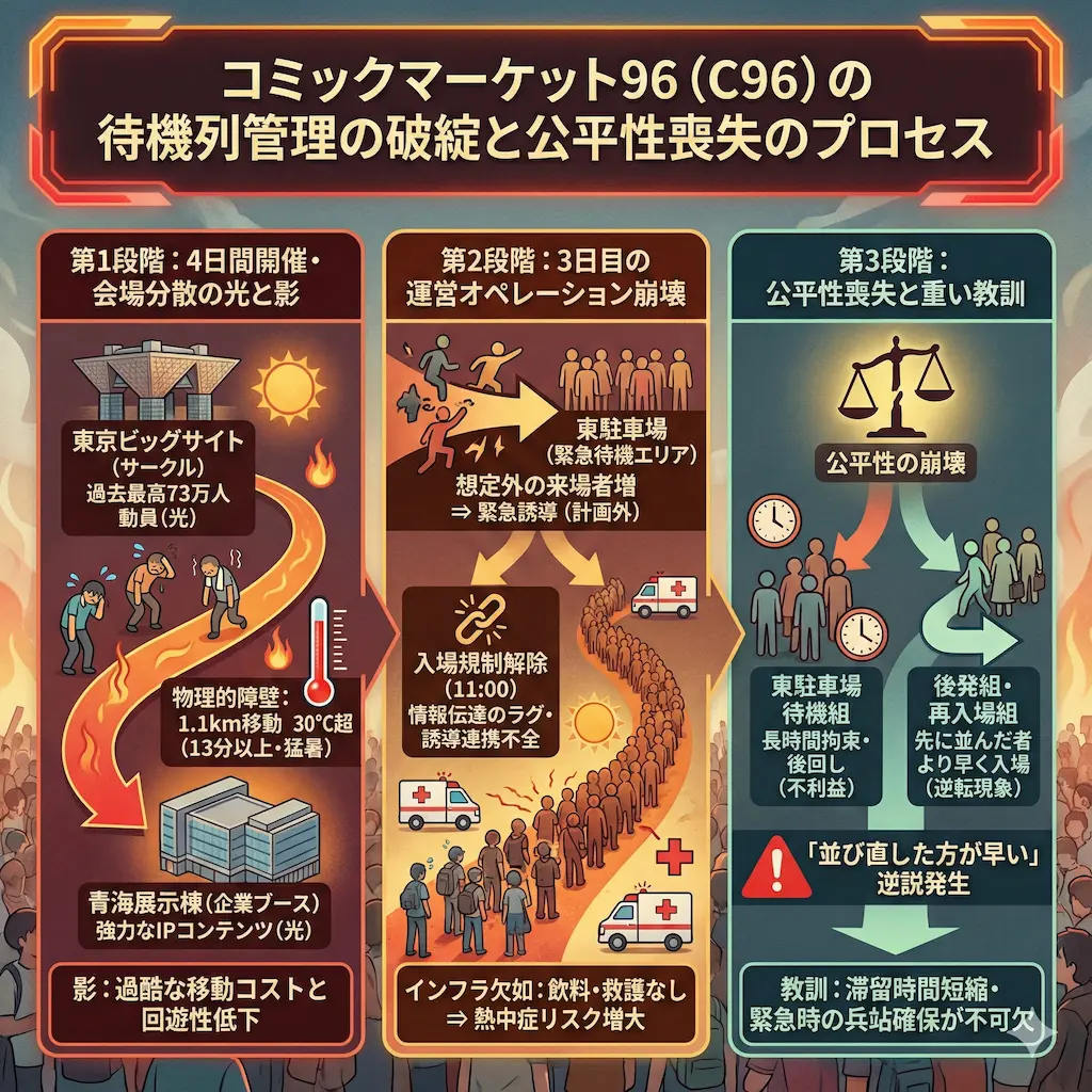 2019年以降のコミケは、オリンピックによる会場問題やパンデミックの影響を受け、かつてない激動の時代を迎えました。私がこの期間の記録を整理していて痛感するのは、失われたものの大きさと、そこから立ち上がるコミュニティの強さです。ここでは、記録的な盛り上がりから中止、そして再開への道のりを詳しく見ていきます。